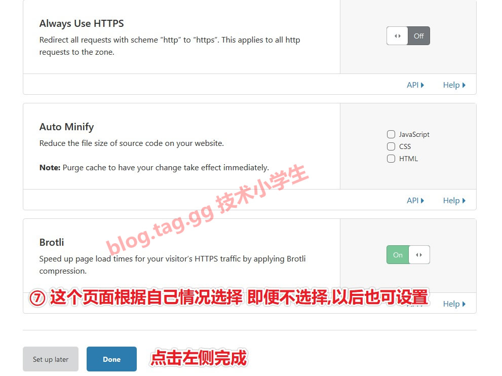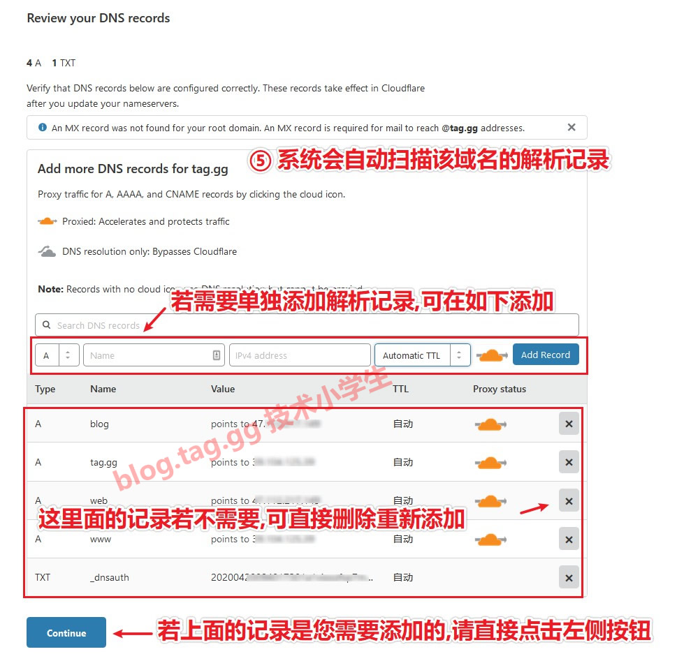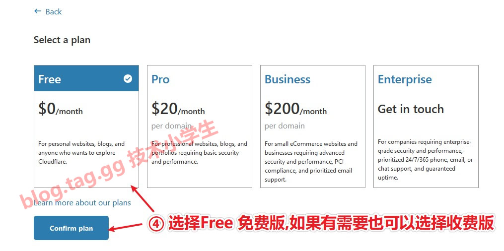 Cloudflare支持中文显示,可在右上角选择中文语言 1、打开 https://dash.cloudflare.com/login 或 https://dash.cloudflare.com/sign-up 打开注册页面,如图 2、参考如下图输入域名。注意,必须输入顶级域名,即便您是二级域名接入,也必须输入顶级域名,请将如图所示的域名更换为您自己的域名。 3、选择套餐,不想花钱可以选择free(收费版比免费版更稳定,cdn节点也更多,总的来说,免费版也很不错。) 4、Cloudflare会自动扫描您的域名解析,并在页面中提示,如果系统扫描的解析是符合您的需求,直接下一步即可,若不符合,可单独在如图所示添加(也可删除某条记录重新添加) 5、Cloudflare默认只支持DNS验证,也就是说,域名DNS必须更改为他们的,如图,页面有提示,更改后需要在Cloudflare后台重新解析(若有做邮件等解析,更换后还需要重新在Cloudflare后台解析才可以,否则无法收发邮件,请格外注意) 6、点击上面按钮后进入如下页面,该页面可以设置ssl或者设置加速的文件类型等,(即便这里不设置,后面也可在会员中心里面设置)