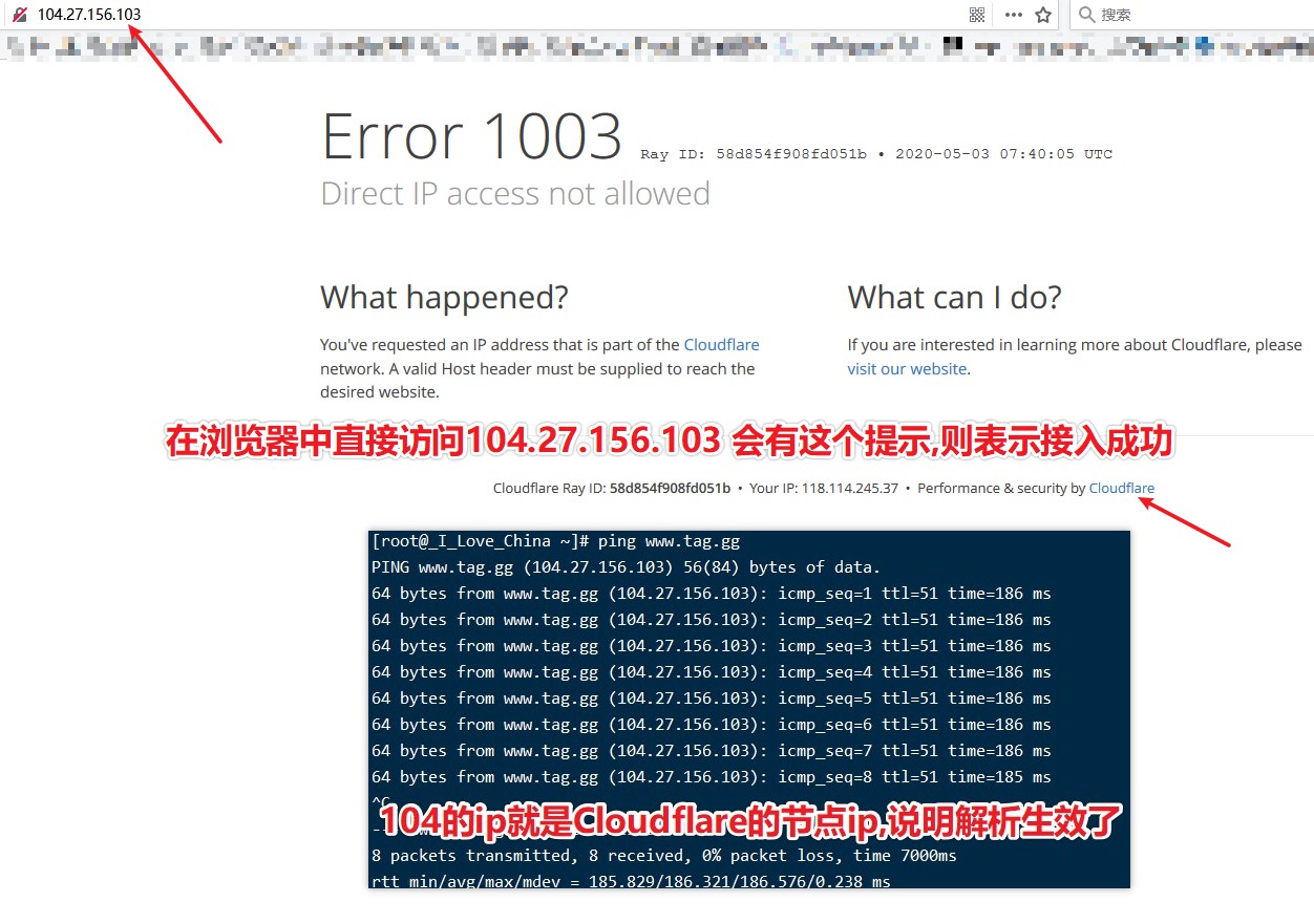 ping下域名,看下ping的ip是否有发生变化,如图,并在浏览器中直接访问这个节点ip会提示 Cloudflare 的信息(此时,如果不出意外,您的网站也应该可以访问了)
