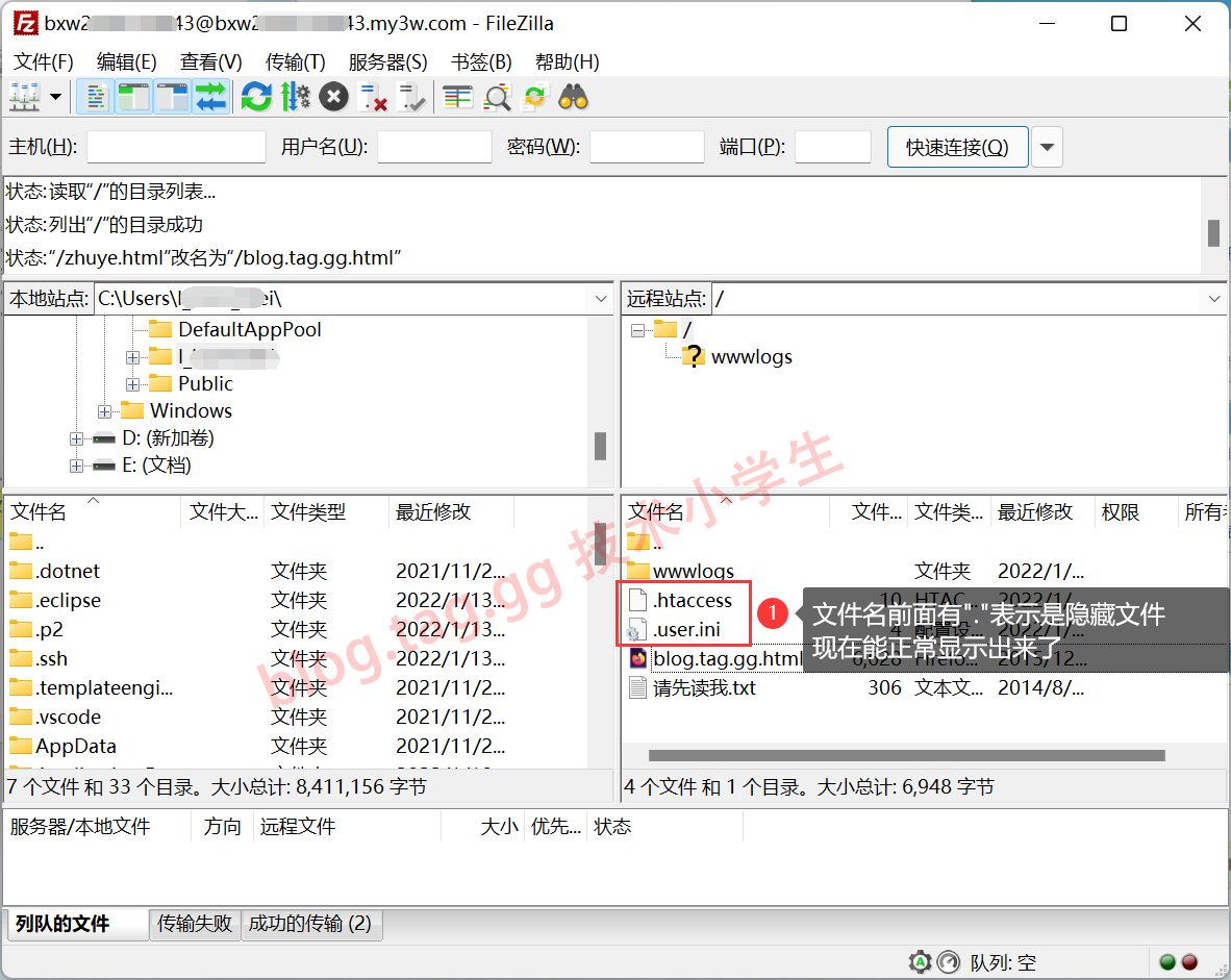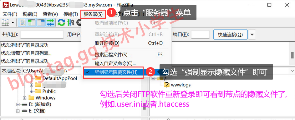前言:在处理问题过程中经常有用户因为网站根目录下存在.user.ini文件影响网站访问,让用户通过FTP改名这个文件,但经常有用户在FTP中找不到这个文件,原因是FTP中默认不会显示带点的隐藏文件,比如.user.ini .htaccess都是隐藏文件,本教程将介绍如何在FileZilla 这款开源的FTP软件中设置显示带点的隐藏文件。