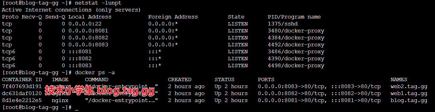 宿主上执行命令“netstat -lunpt”可以看到如下:[root@blog-tag-gg ~]# docker ps -a