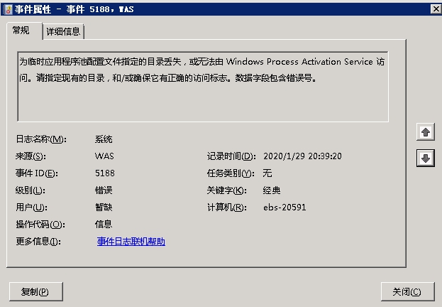 为临时应用程序池配置文件指定的目录丢失,或无法由 Windows Process Activation Service 访问。请指定现有的目录,和/或确保它有正确的访问标志。数据字段包含错误号。
