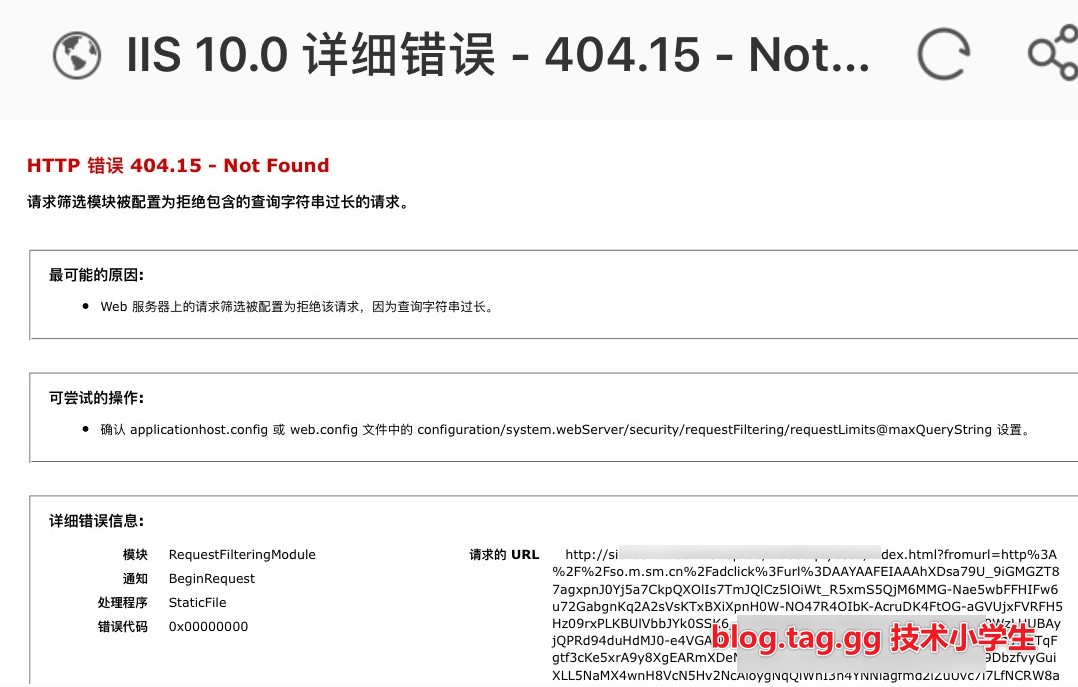 前言:今天用户反馈网站访问提示“请求筛选模块被配置为拒绝包含的查询字符串过长的请求”报错如图,通过报错提示以及用户反馈的url地址看是网站地址太长导致,解决方法也很简单,若您遇到了。可参考如下处理