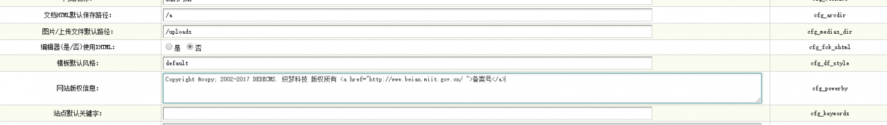 dede程序设置备案号十分简单,dede本身就支持后台设置备案号,在系统-系统基本参数-网站版权信息: