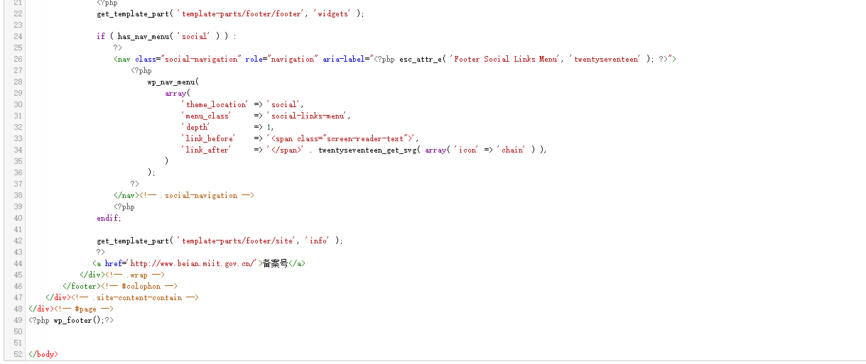到网站空间/wp-content/themes目录下找到主题Twenty Seventeen,在主题目录下午找到页脚文件footer.php 文件,在