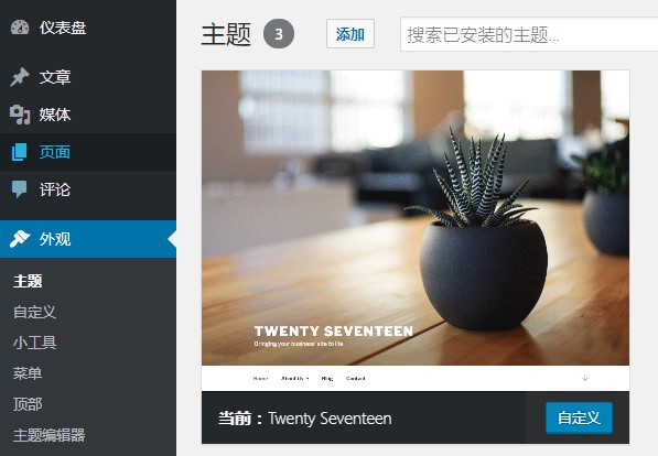 在网站后台-外观-主题中查看当前使用的是哪个主题:Twenty Seventeen。